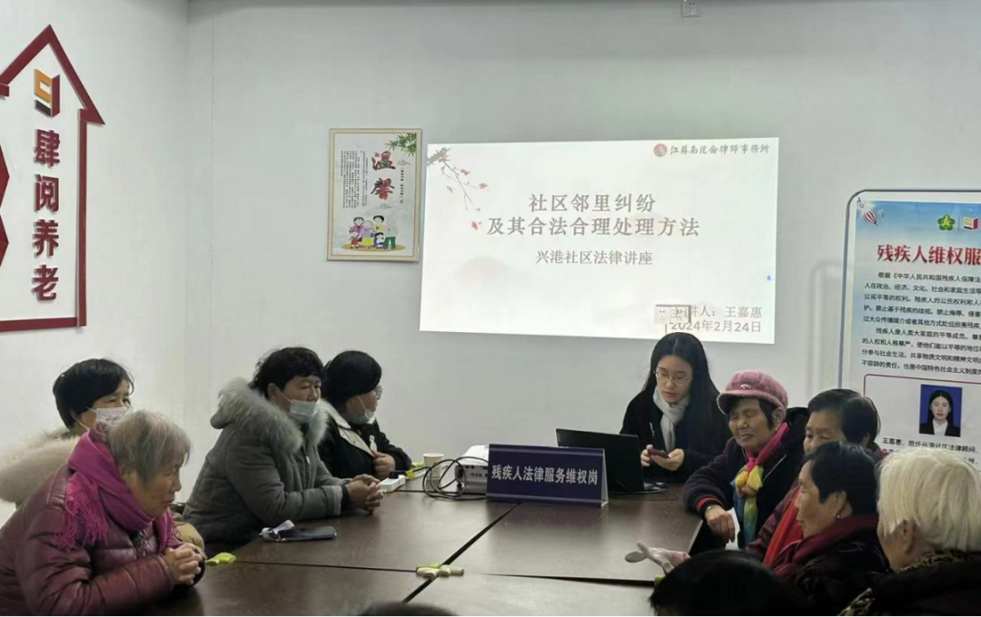 讲座中,王嘉惠律师首先向居民们普及了相邻关系的概念,相邻权在我们日常生活中非常常见,如楼上漏水、邻居深夜打麻将噪声大、违建影响采光、楼内私装摄像头等等问题。其次,律师深入浅出的剖析当相邻权受到侵害时如何采取合法合理当方式进行处理。然后律师“以案说法”给大家分析了三例生活中常见的相邻权纠纷,并给出了相应的解决措施。最后王嘉惠律师建议,如果在日常生活中发生了相邻权纠纷时,可先考虑协商和解,毕竟远亲不如近邻;此外借助第三方或居委会进行调解也是一个不错的选择;必要时可向行政部门投诉或举报或法院起诉。“家和万事兴 邻里一家亲”,大家既要树立法律意识,用法律维护各自权利,也要尊重他人的相邻权,邻里之间相互尊重、互谅互让,团结互助,才是解决相邻问题的根本手段。